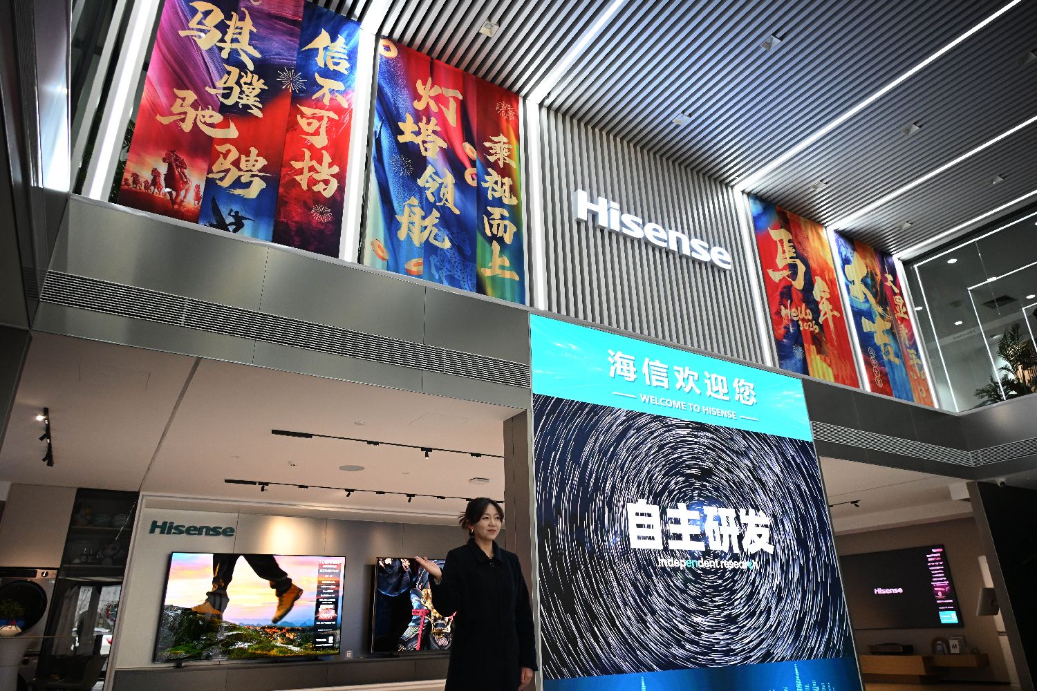 海信视像首创基于AI的数字化工艺设计模式,沉淀出超过10万条工艺数据的知识库,结合自主研发的星海大模型,可迅速自动生成涵盖工序步骤、操作要求、物料分配等全要素的工艺方案,搭配大量智能工业机器人的应用,在减轻传统人工劳动强度同时,大大地提升了生产效率和产品质量。图为海信视像青岛工厂迎宾展示大厅(1月13日摄)。(图片来源:本文图片均据新华社)
