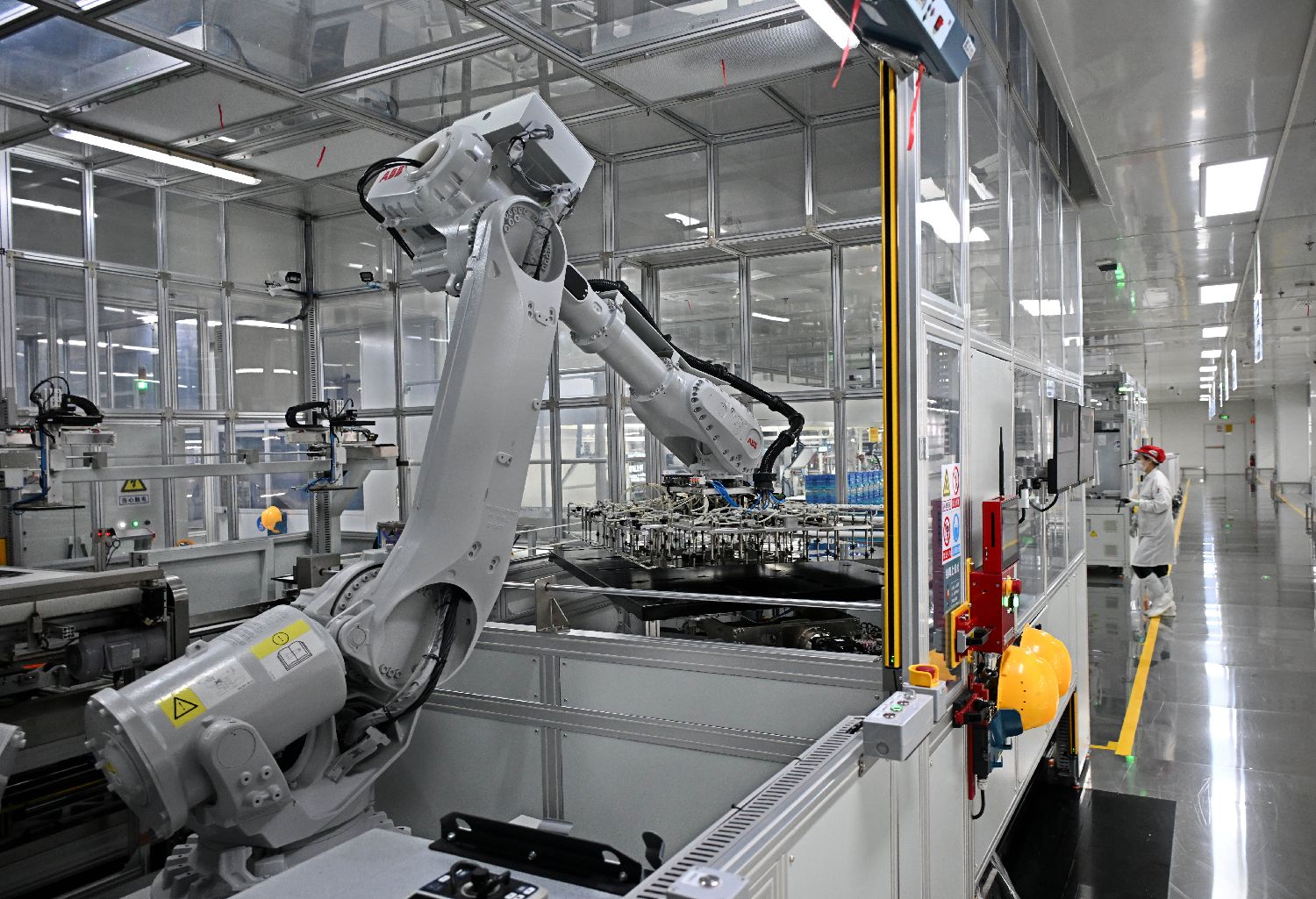 工业机器人在海信视像青岛工厂智能装配线上忙碌(1月13日摄)。
