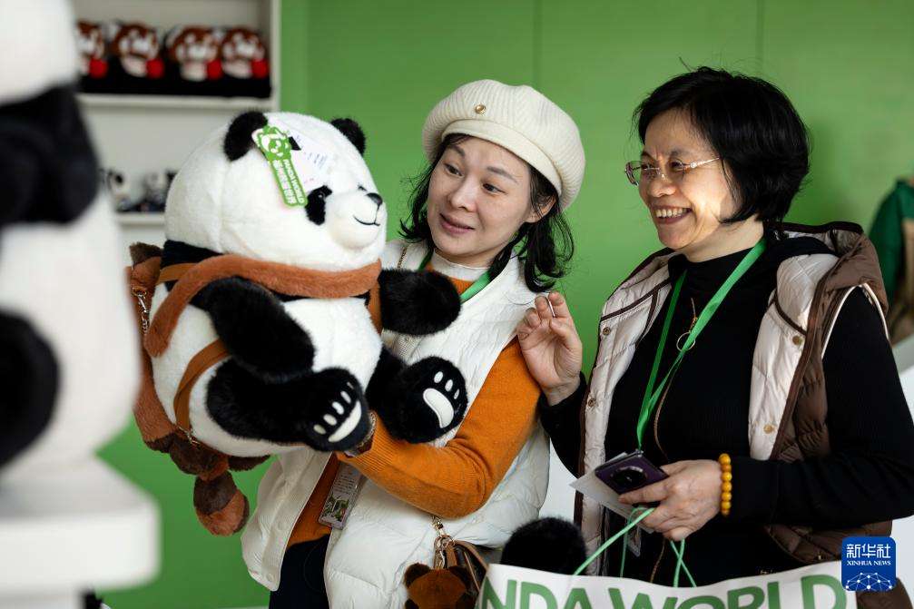 1月17日,游客在文创售卖区选购大熊猫文创礼品。