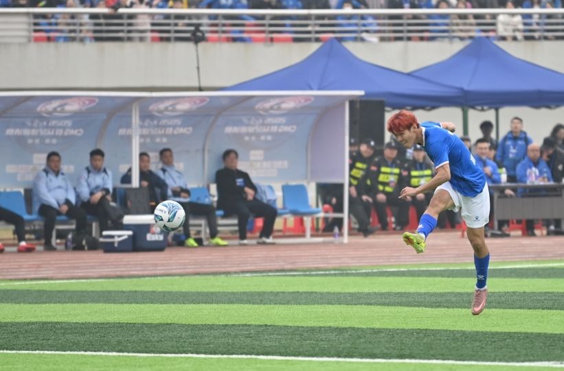 1月18日,湖南永州,2026CMG群众足球邀请赛揭幕战举行,永州队7号球员林昊进球得分。(图片来源:中新社)