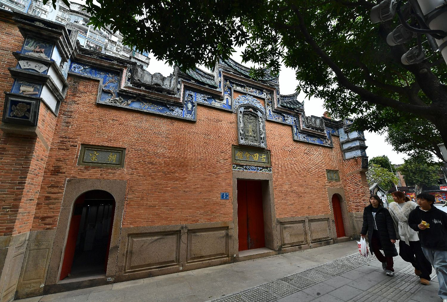 图为民众从古田会馆旁经过。(图片来源:中新社)
