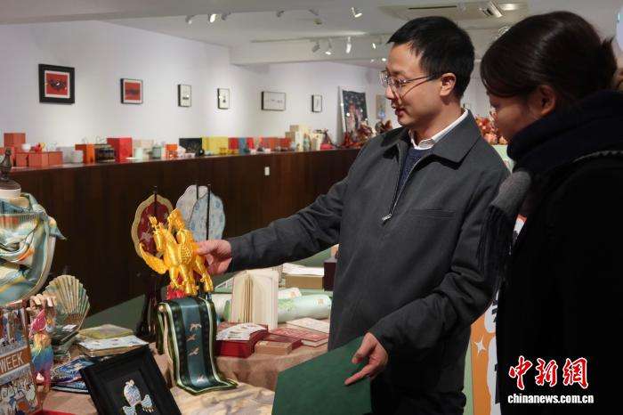 1月21日,工作人员(左)向游客介绍根据唐代翼马纹样设计的文创产品。