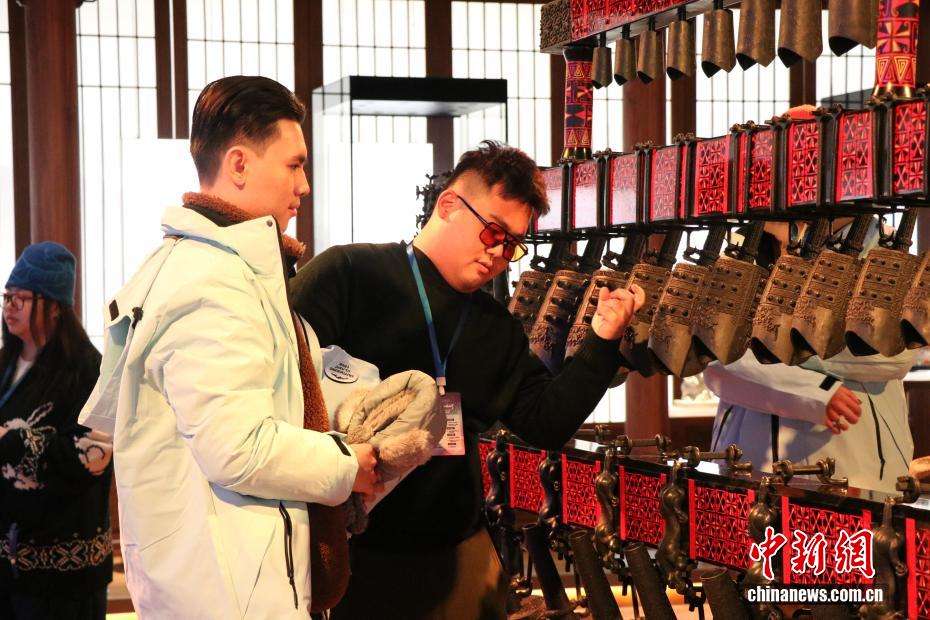 图为台湾青年在新疆非物质文化遗产馆内体验编钟。