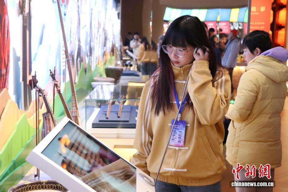 图为台湾青年在新疆非物质文化遗产馆内收听讲解。