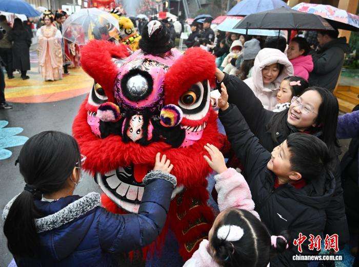 图为孩子们争相摸狮头。