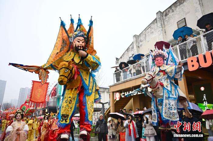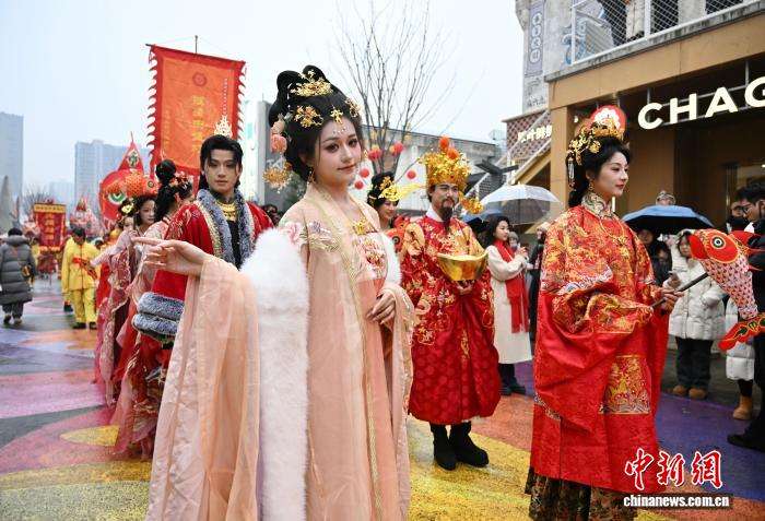图为众多穿着不同形制、款式、元素服饰的演员参与新春巡游。