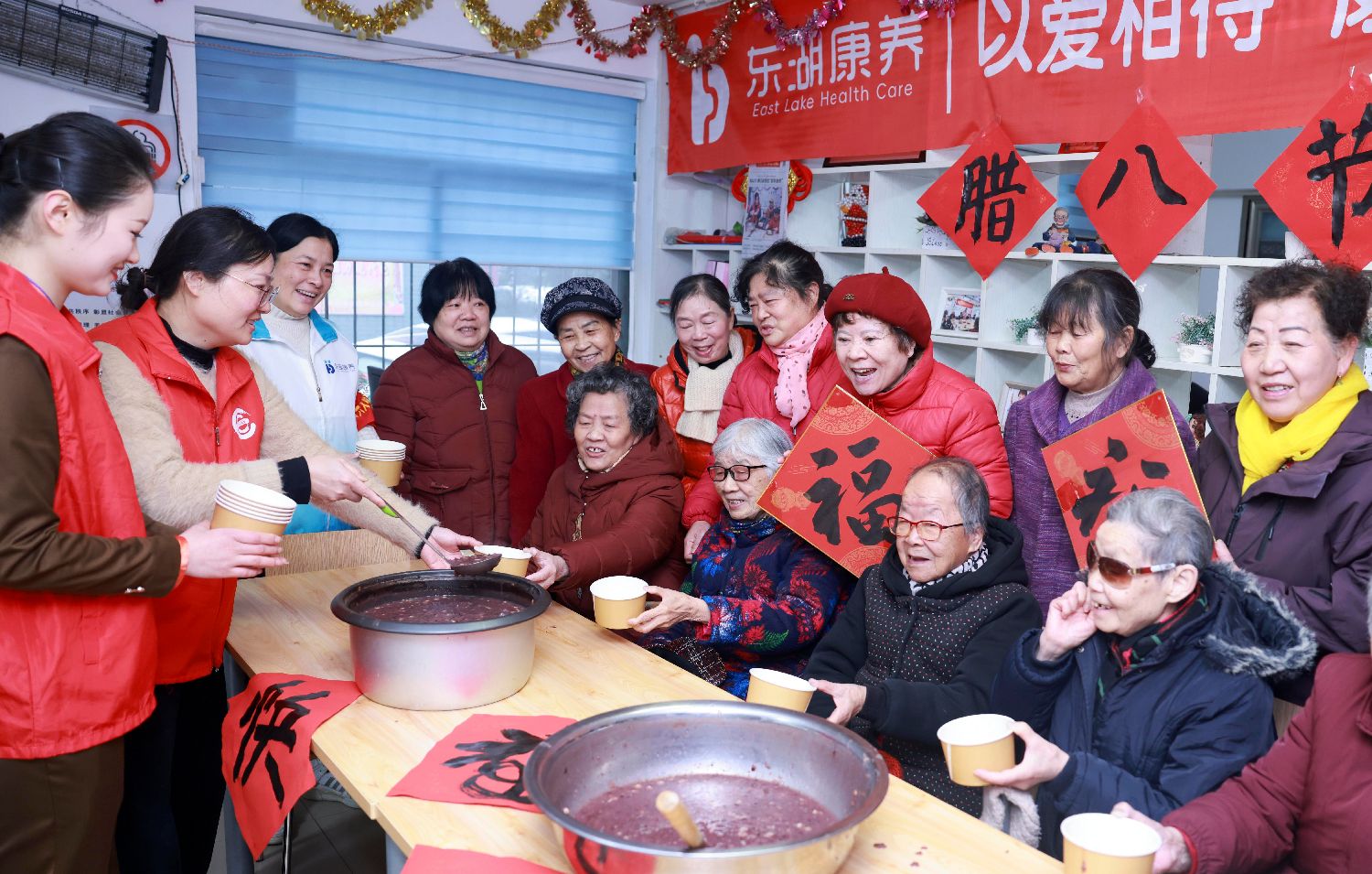 1月25日,在湖北省武汉市黄鹤楼街道读书社区老年人活动中心,老年人品尝腊八粥。(图片来源:本文图片均据新华社)