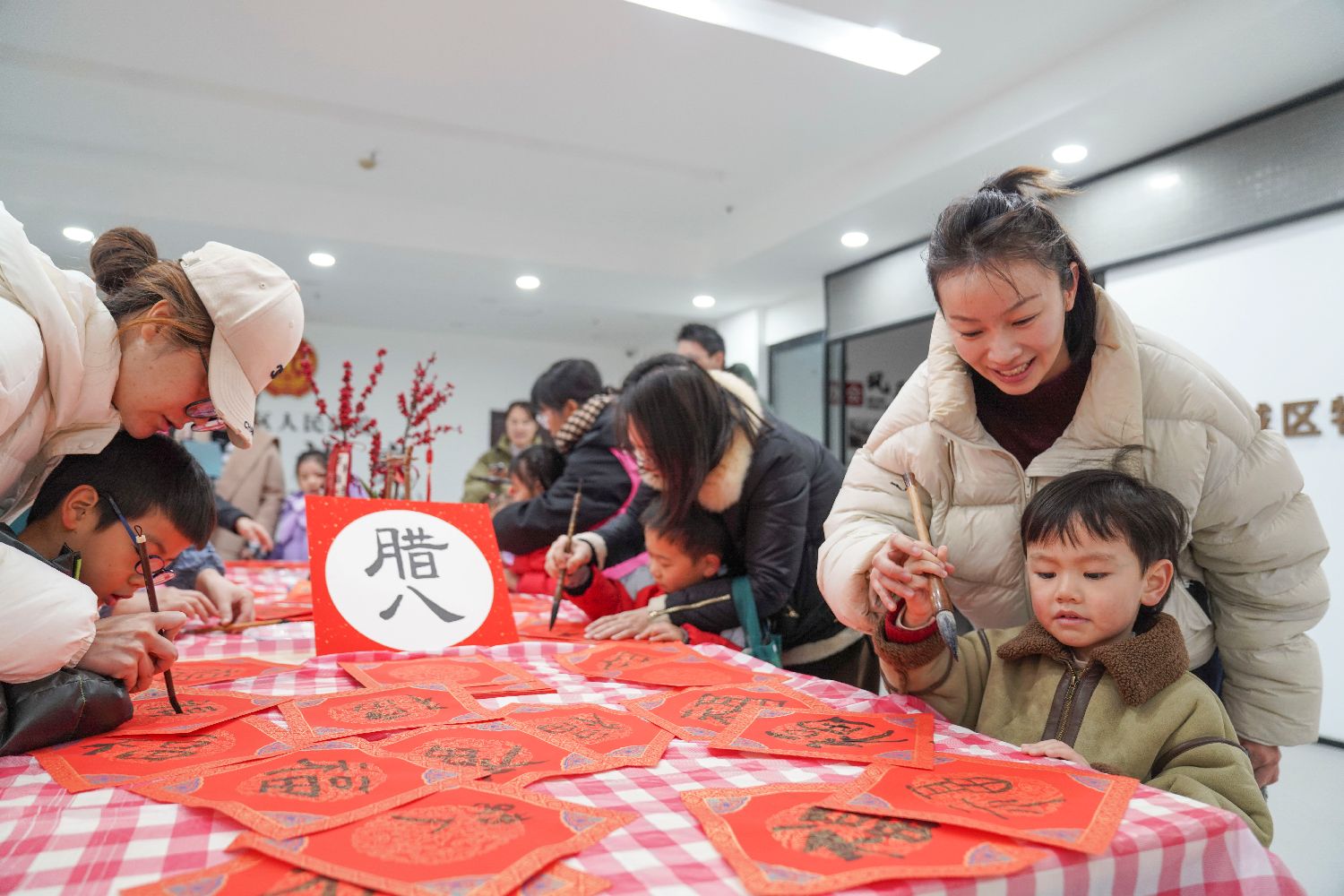 1月25日,在浙江省温州市鹿城区大南街道双莲桥社区,孩子与家长参加腊八节传统文化主题活动。