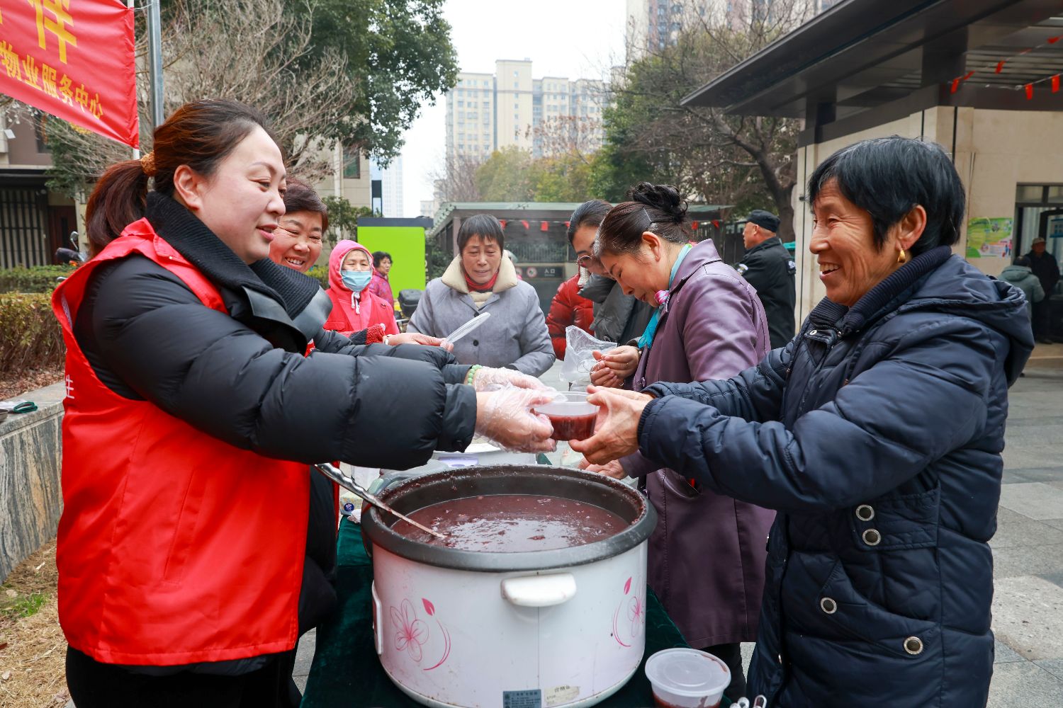 1月25日,江苏省泰兴市济川街道张陈社区泰和苑小区内,志愿者给居民盛腊八粥。