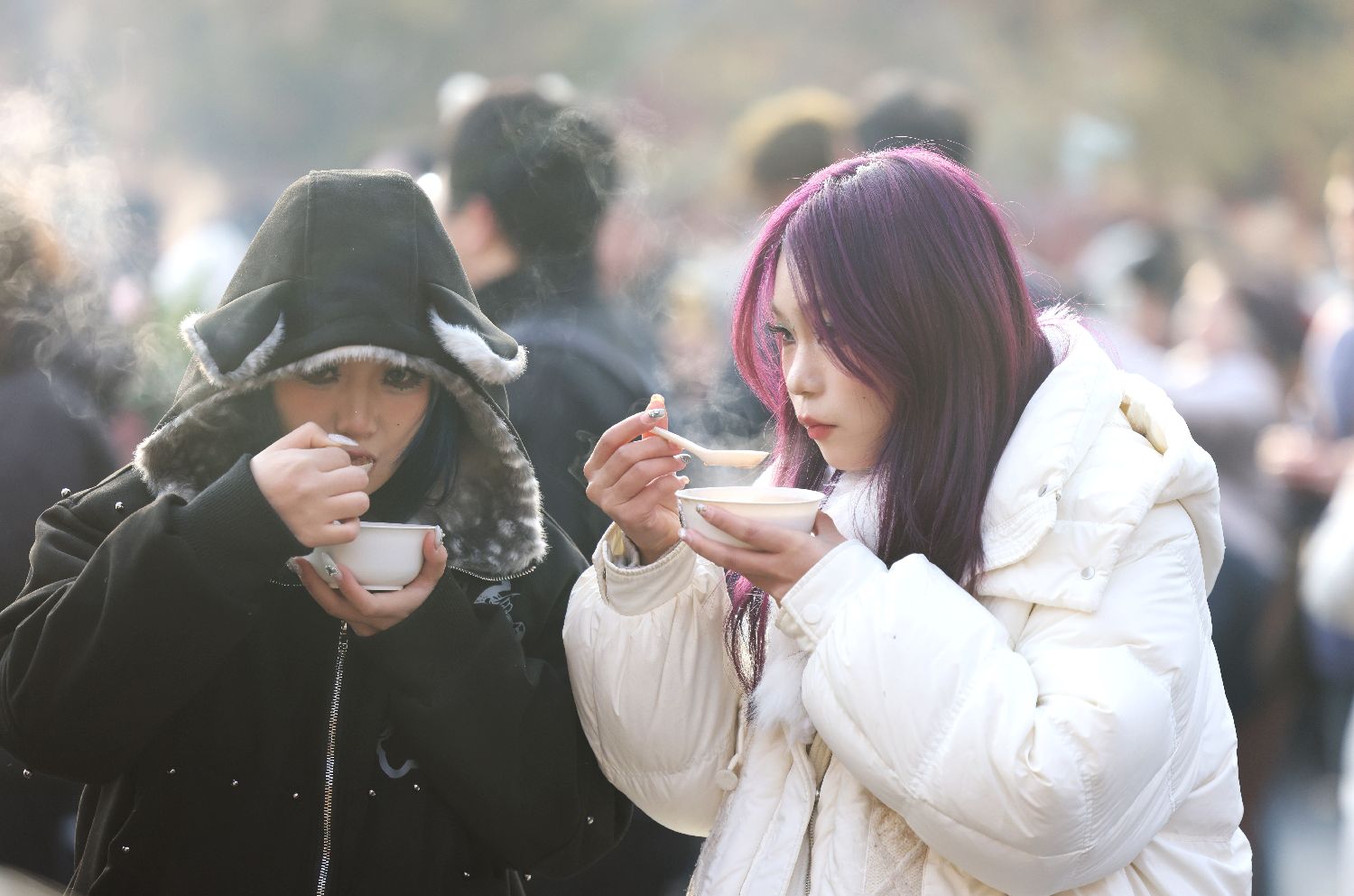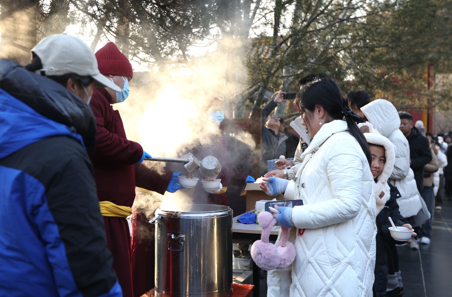 2026年1月26日,民众在北京雍和宫品尝腊八粥。