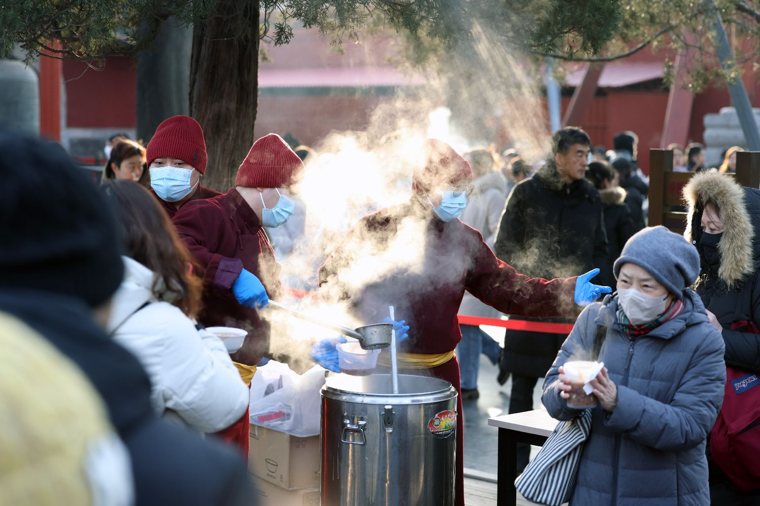 2026年1月26日,北京雍和宫工作人员为民众放发腊八粥。