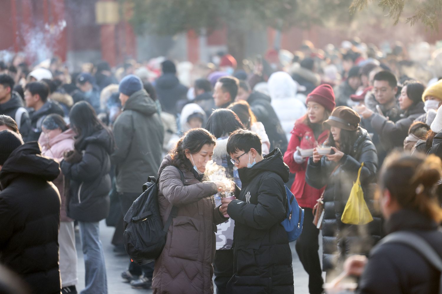 2026年1月26日,民众在北京雍和宫排队品尝腊八粥。
