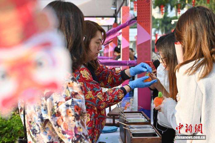 图为香港非物质文化遗产办事处的吹糖技艺摊位吸引游客体验。(图片来源:中新网)