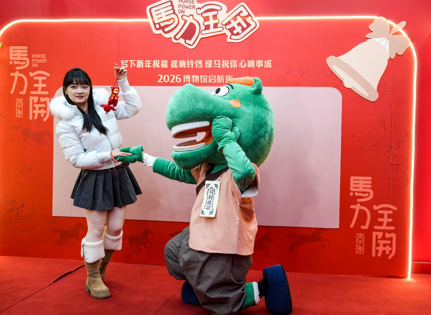 1月26日晚,在甘肃省博物馆一楼大厅,马踏飞燕IP人偶在“马力全开——博物馆启航夜”活动现场与观众互动。