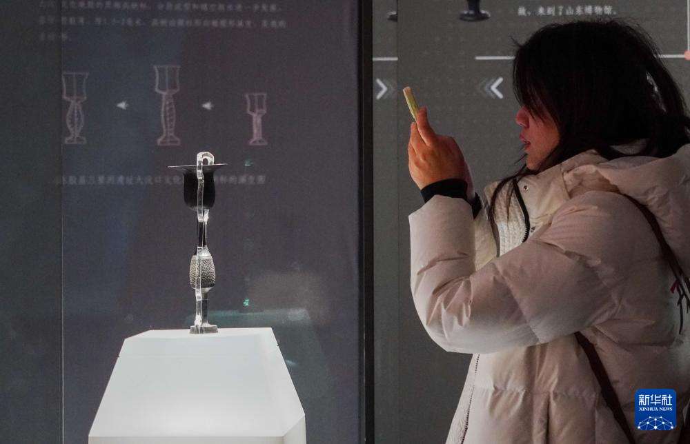 1月27日,在山东博物馆“对话蛋壳黑陶高柄杯”明星文物展上,一名参观者观看龙山文化蛋壳黑陶高柄杯。