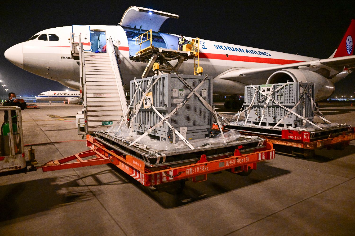 北京时间1月28日凌晨,大熊猫“晓晓”“蕾蕾”飞抵成都天府国际机场。(图片来源:本文图片均据新华社)