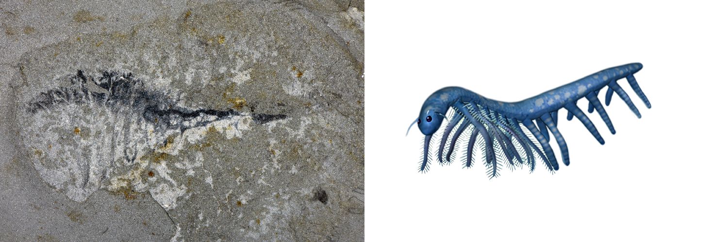 花垣生物群叶足动物-柯林斯虫化石图(左)和复原图。