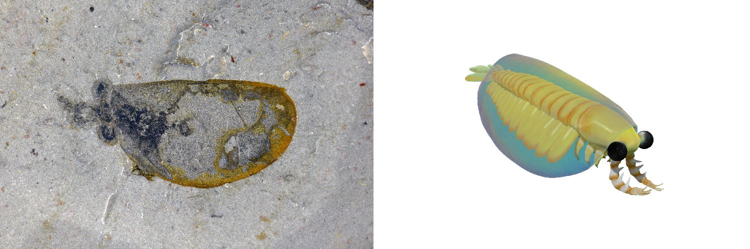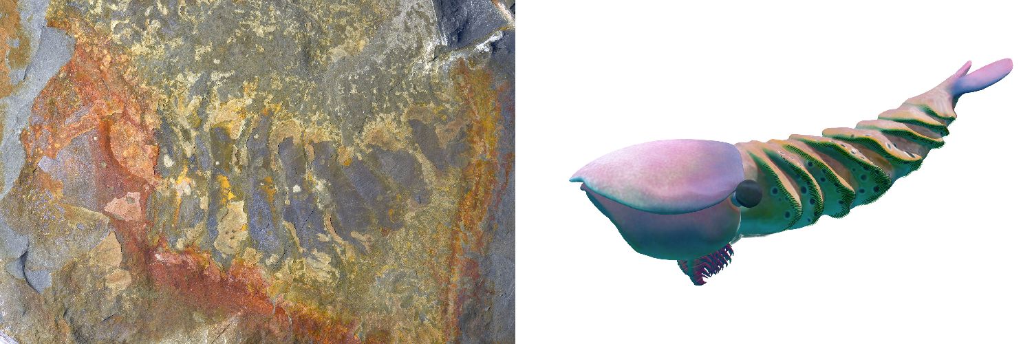 花垣生物群射齿类节肢动物-赫德虾类化石图(左)和复原图。