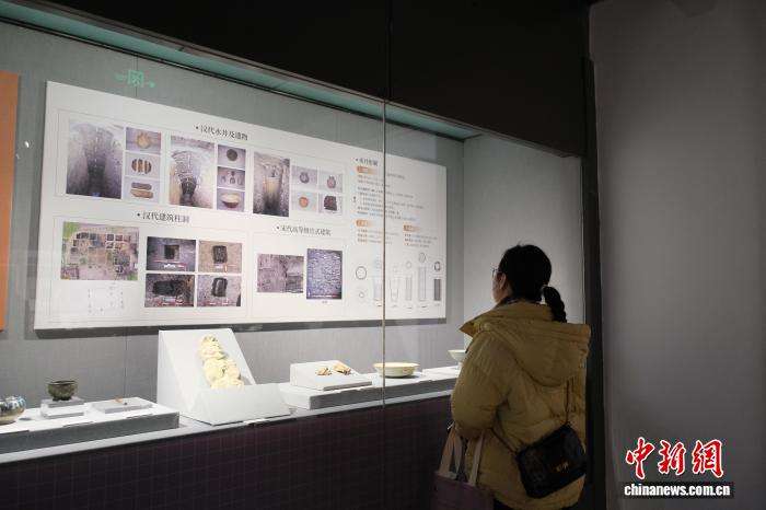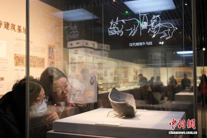 1月29日,游人在绍兴稽中遗址出土的汉代刻划“牛、马动物纹”陶罐前驻足。(图片来源:本文图片均据中新网)