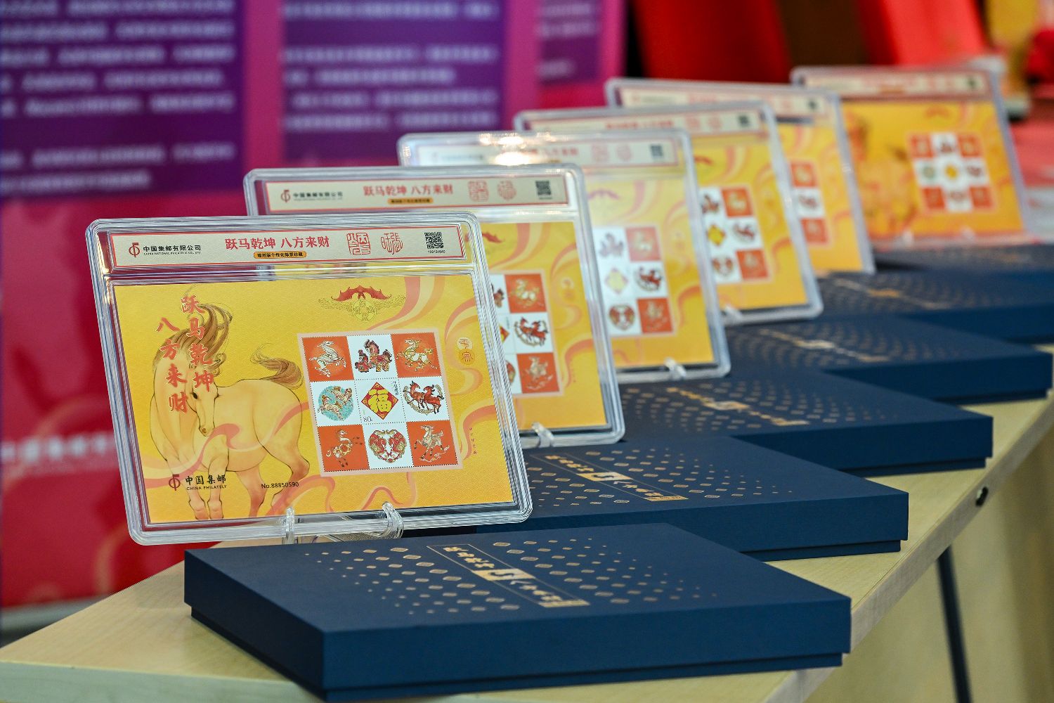 活动现场摆放的《跃马乾坤 八方来财》雕刻版生肖主题邮票珍藏摆件(1月29日摄)。