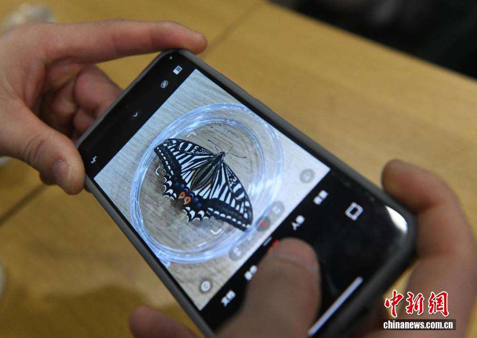 图为此次太空生命试验搭载的蝴蝶品种标本吸引参观者拍照留念。