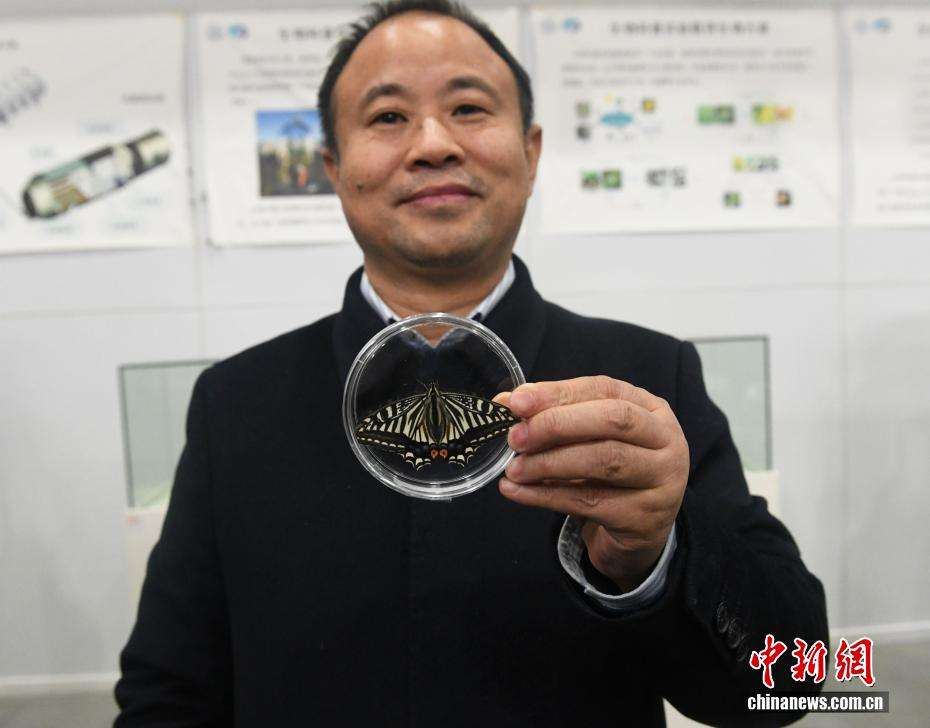 图为重庆大学空天科学与技术研究院院长、“神农开物2号”试验项目总指挥兼总设计师谢更新展示此次太空生命试验搭载的蝴蝶品种标本。
