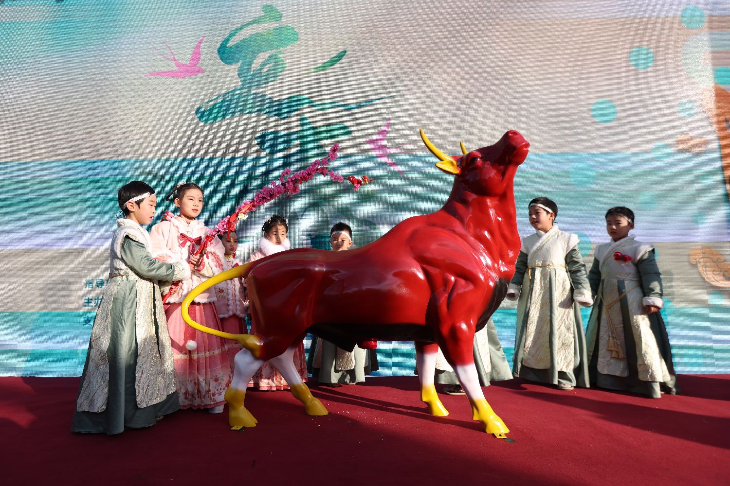 2月4日,活动现场,“春姑娘”“牛童”手持花枝鞭打春牛。当日是立春节气,第十九届立春文化活动在北京古观象台举行。文化活动重点展示立春时节“打春牛”等传统民俗,结合文艺表演、文旅市集等互动活动,让市民在民俗中体验传统文化的魅力,喜迎春天的到来。立春是二十四节气中的第一个节气,意味着万物复苏、春回大地。自古以来,人们在这一天祭春神、鞭春牛,祈愿新的一年风调雨顺、五谷丰登。(图片来源:本文图片均为卞戈摄)