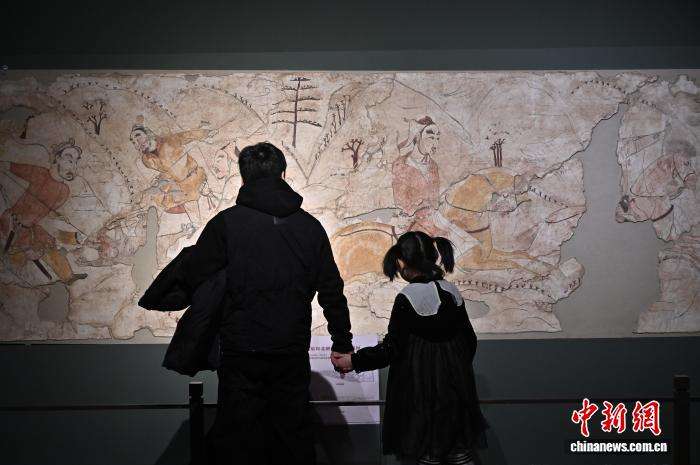 图为民众参观“相马——马文物特展”中的山西忻州九原岗北朝壁画。
