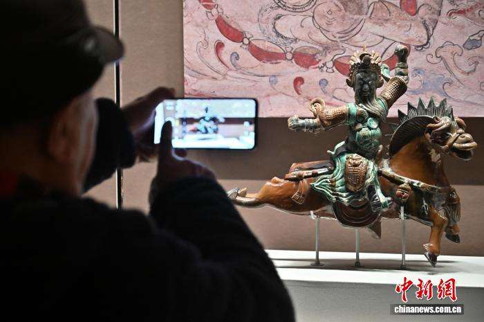 图为民众参观“相马——马文物特展”中明代的琉璃将军飞马脊饰。