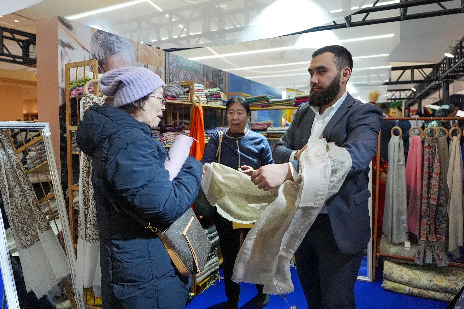 2月4日,在“共享大市场·出口中国”2026年首场活动暨北京国际精品荟的进口商品推介区,参观者(左)购买展出的乌兹别克斯坦围巾。