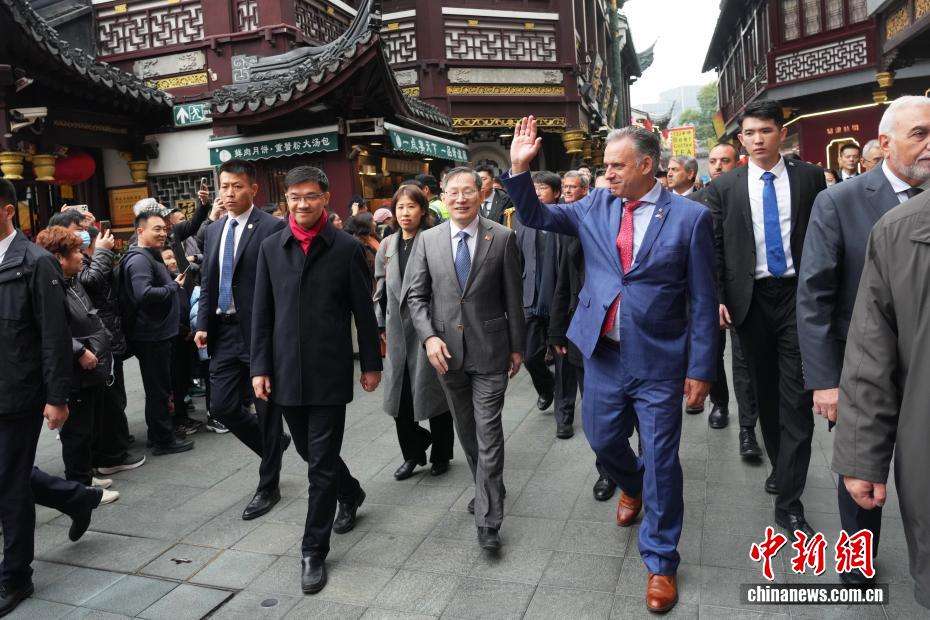 图为乌拉圭总统奥尔西到访豫园,与市民同游。
