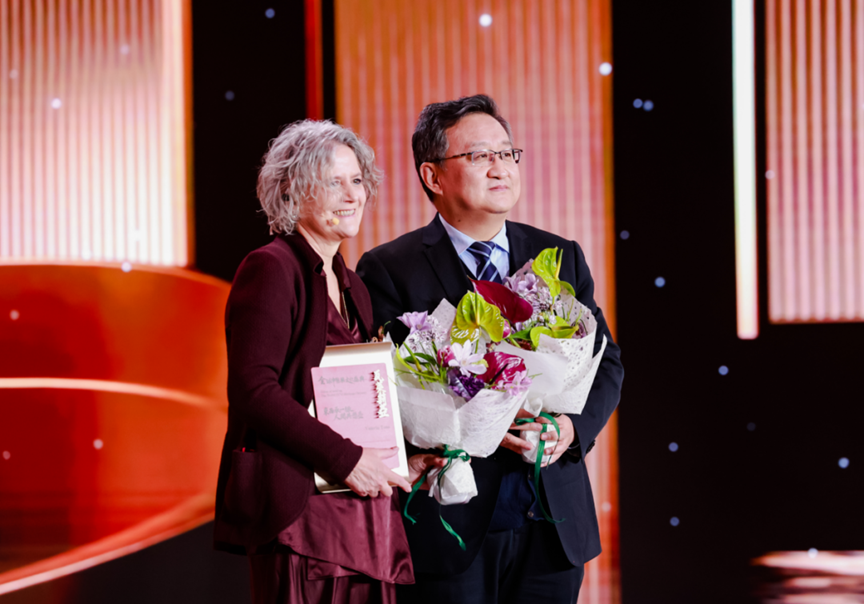 意大利医者瓦莱利亚,作为经络大师王居易的弟子,在意大利身体力行传承与传播中医,她在盛典现场深情朗读“写给中医的信”,展现其从技艺到生命哲学的领悟,以及中医在其家庭中形成的独特“共感”与传承。北京中医药大学副校长王停为瓦莱利亚颁奖,赞许其以数十年的虔诚实践,生动诠释了中医“师承”二字超越国界的力量。