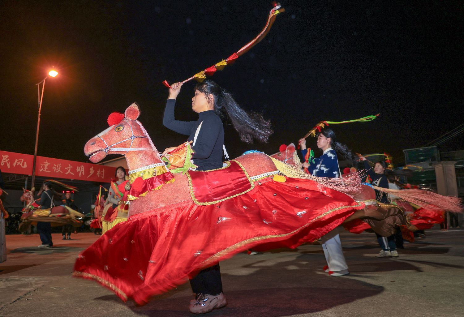 2月4日,在广东省潮州市饶平县霞西村,霞西布马舞队队员进行布马舞排练。