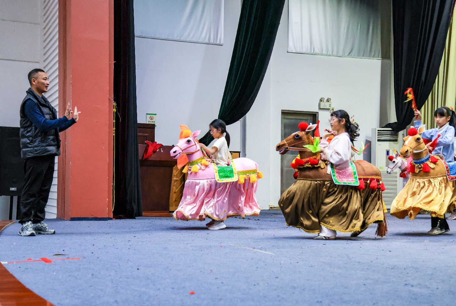 2月4日,在广东省潮州市饶平县青少年宫,饶平布马舞市级代表性传承人刘树钊指导少儿布马舞队队员排练。