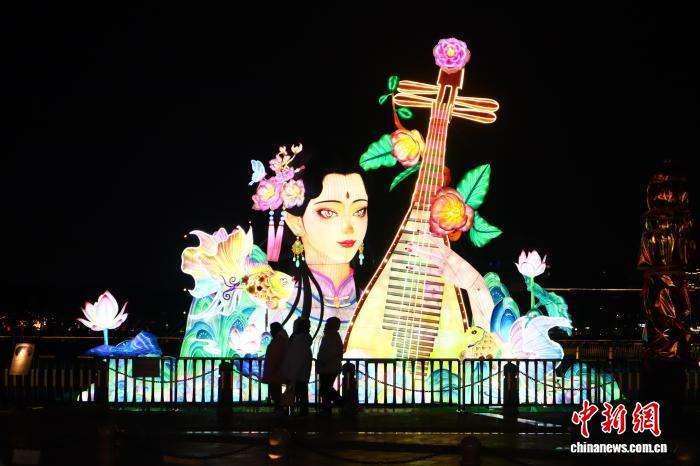 2月7日晚,浙江平湖,以平湖派琵琶为灵感的“琵琶仙女”灯组吸引民众欣赏。