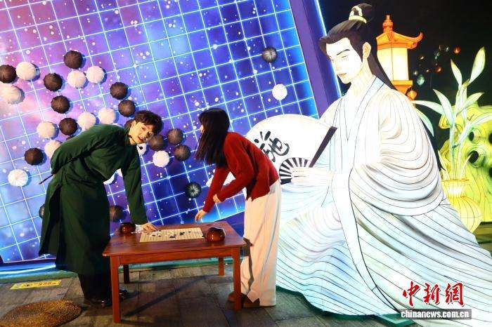 2月7日晚,浙江平湖,“当湖十局”灯组前,民众与工作人员互动。