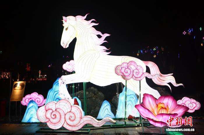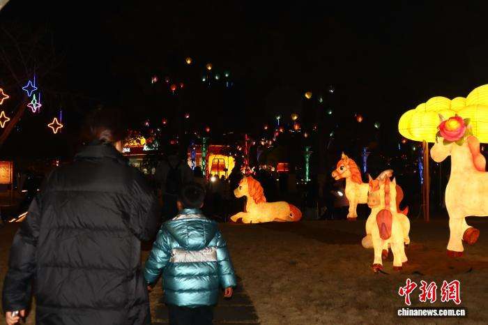 2月7日晚,浙江平湖,造型可爱的小马花灯吸引民众。