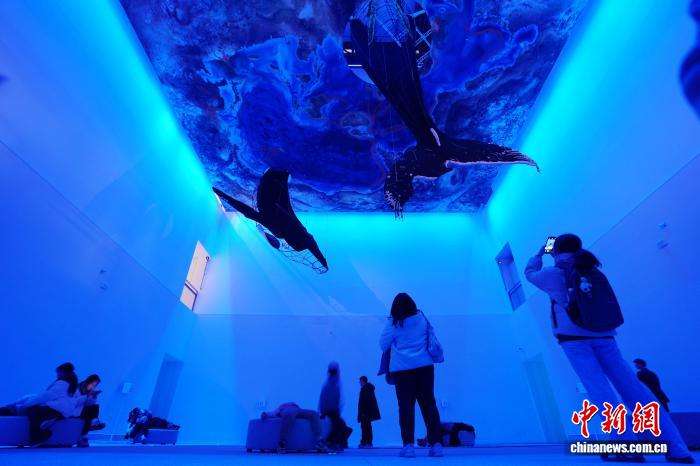 图为在幽蓝的灯光下,观众驻足仰望,仿佛置身于深邃的海底世界。