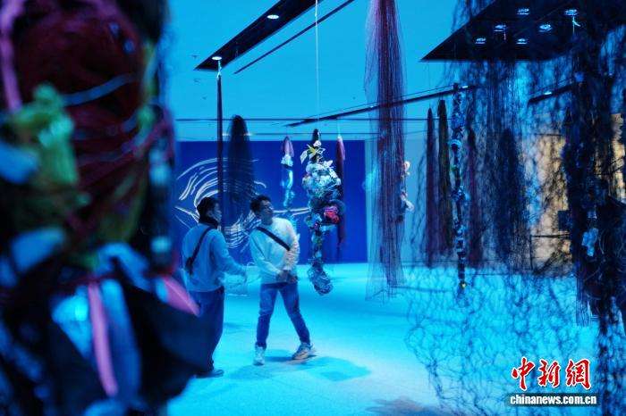 图为观众穿梭在由塑料瓶、渔网等海洋垃圾构成的艺术装置中。
