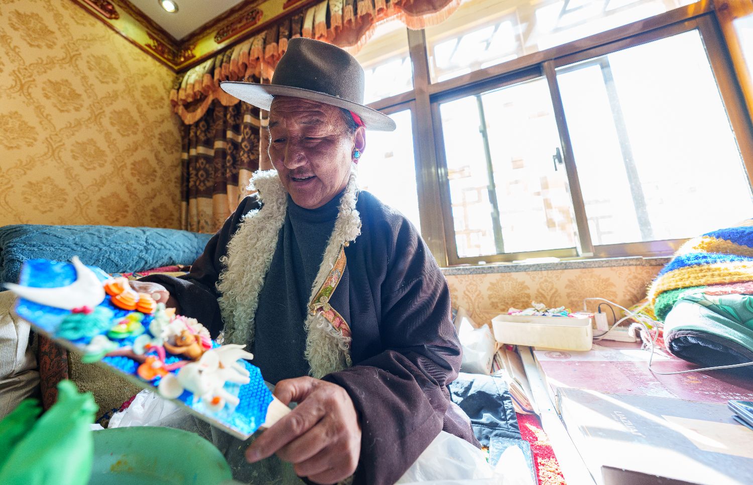2月12日,在拉萨市林廓东路,来自西藏日喀则市仁布县普松乡的手工艺人罗布在制作酥油花。