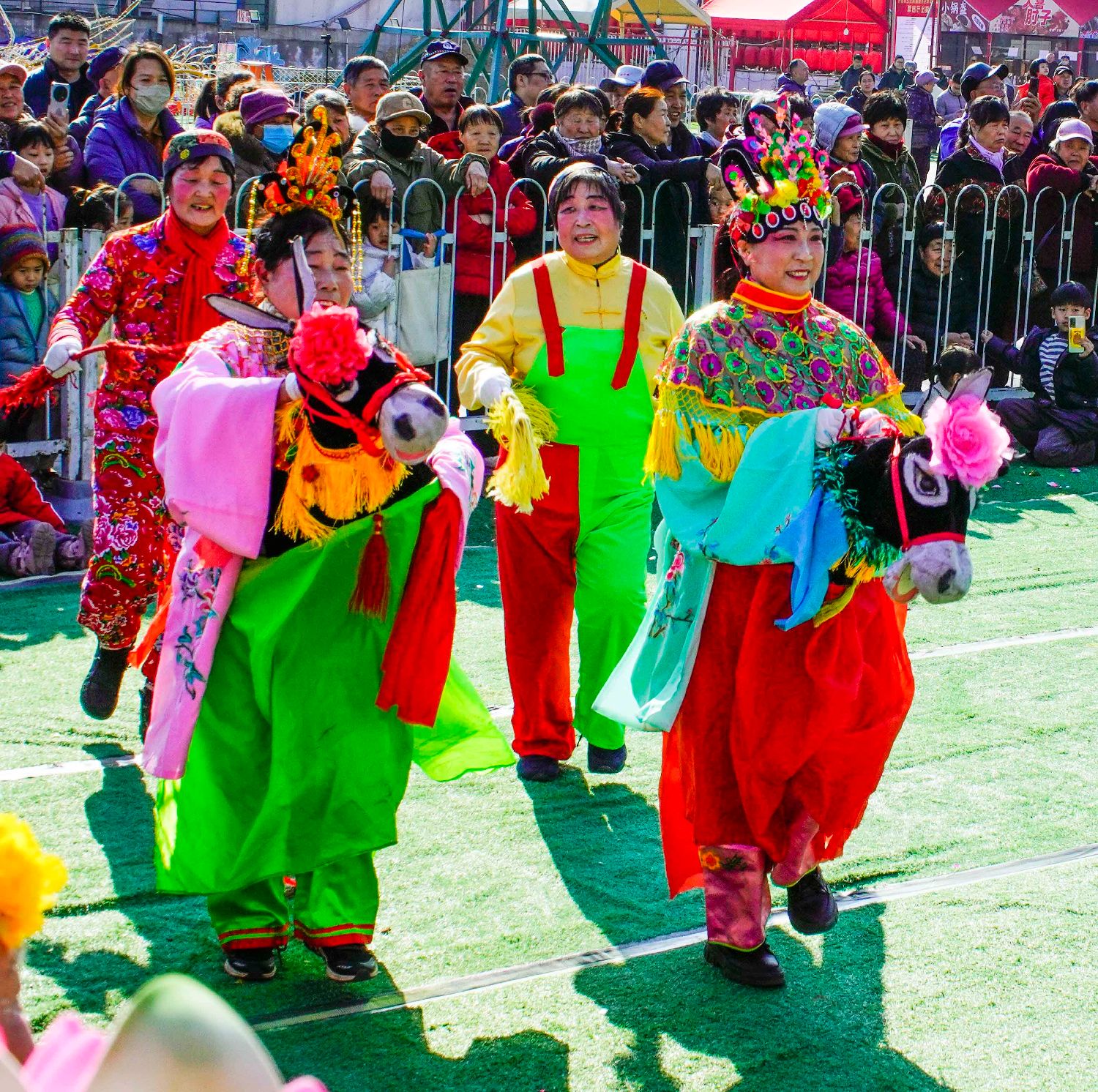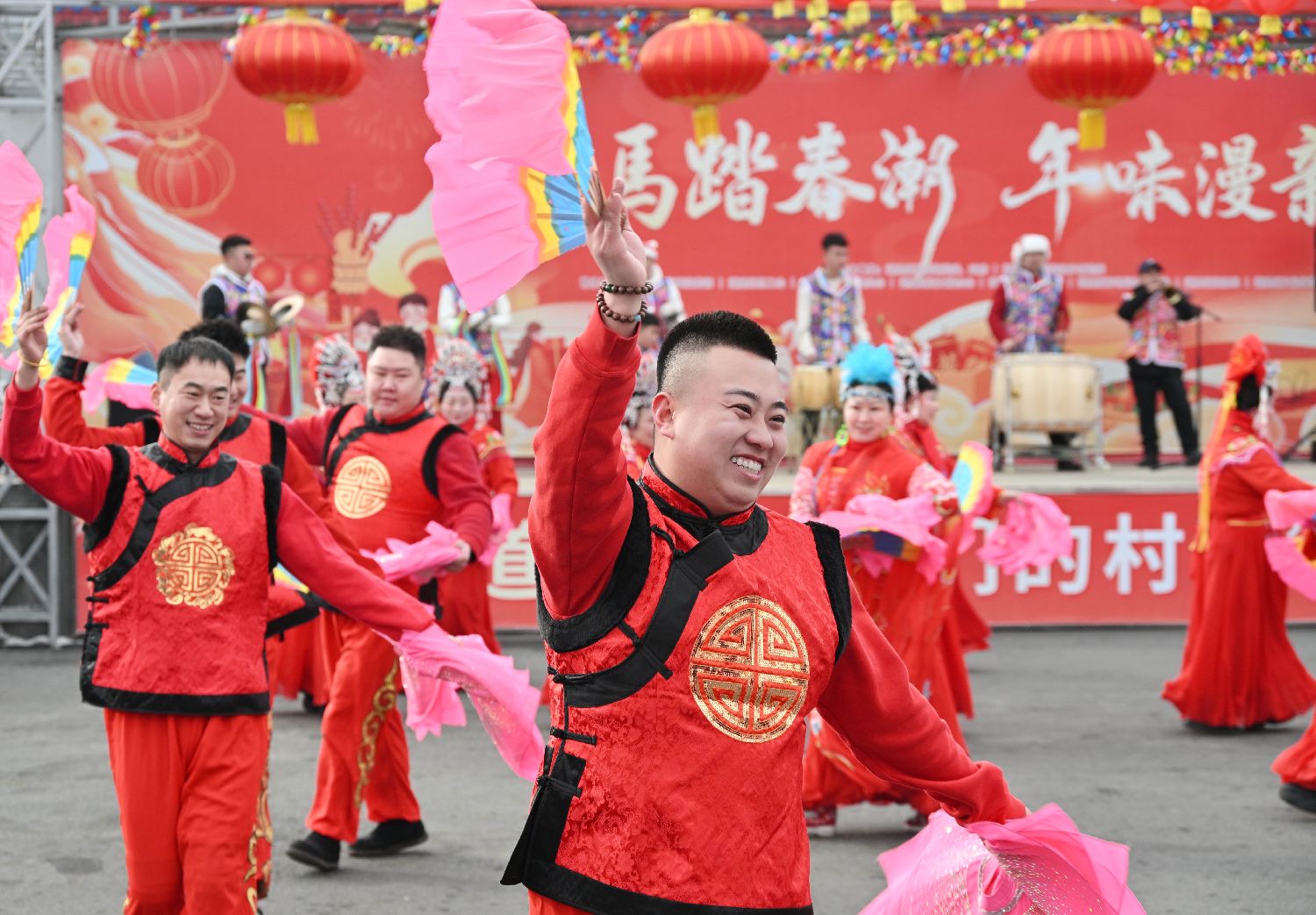 2月12日,民间花会队在北京市平谷区苹东市集广场演出民俗节目。