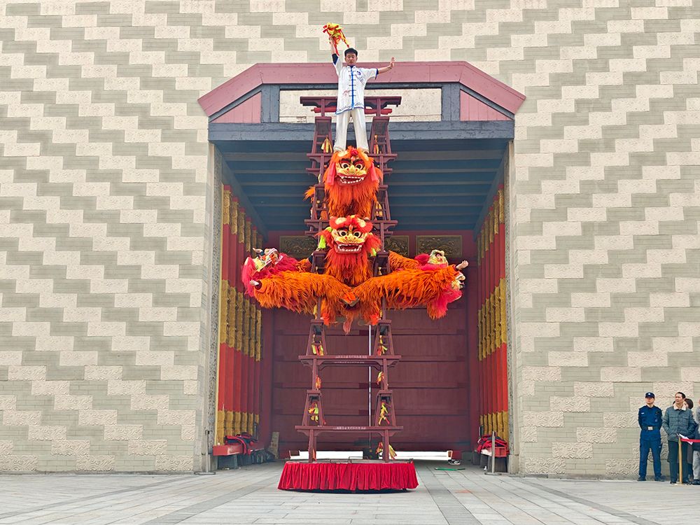鼓声一响,20余条普通板凳应声而起,横竖交叠,节节攀升。眨眼间,一座离地数米、由这些板凳垒成的13层“高塔”,便矗立于场中。春节期间,被誉为“空中绝技”的山西襄汾天塔狮舞,在陶寺遗址博物馆南广场震撼上演。