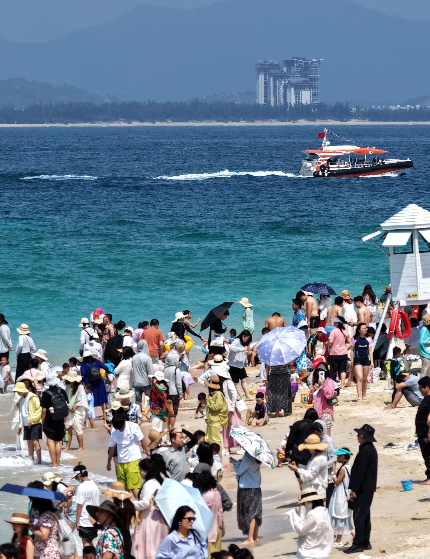 2月22日,游客在三亚市蜈支洲岛踏浪戏水(无人机照片)。