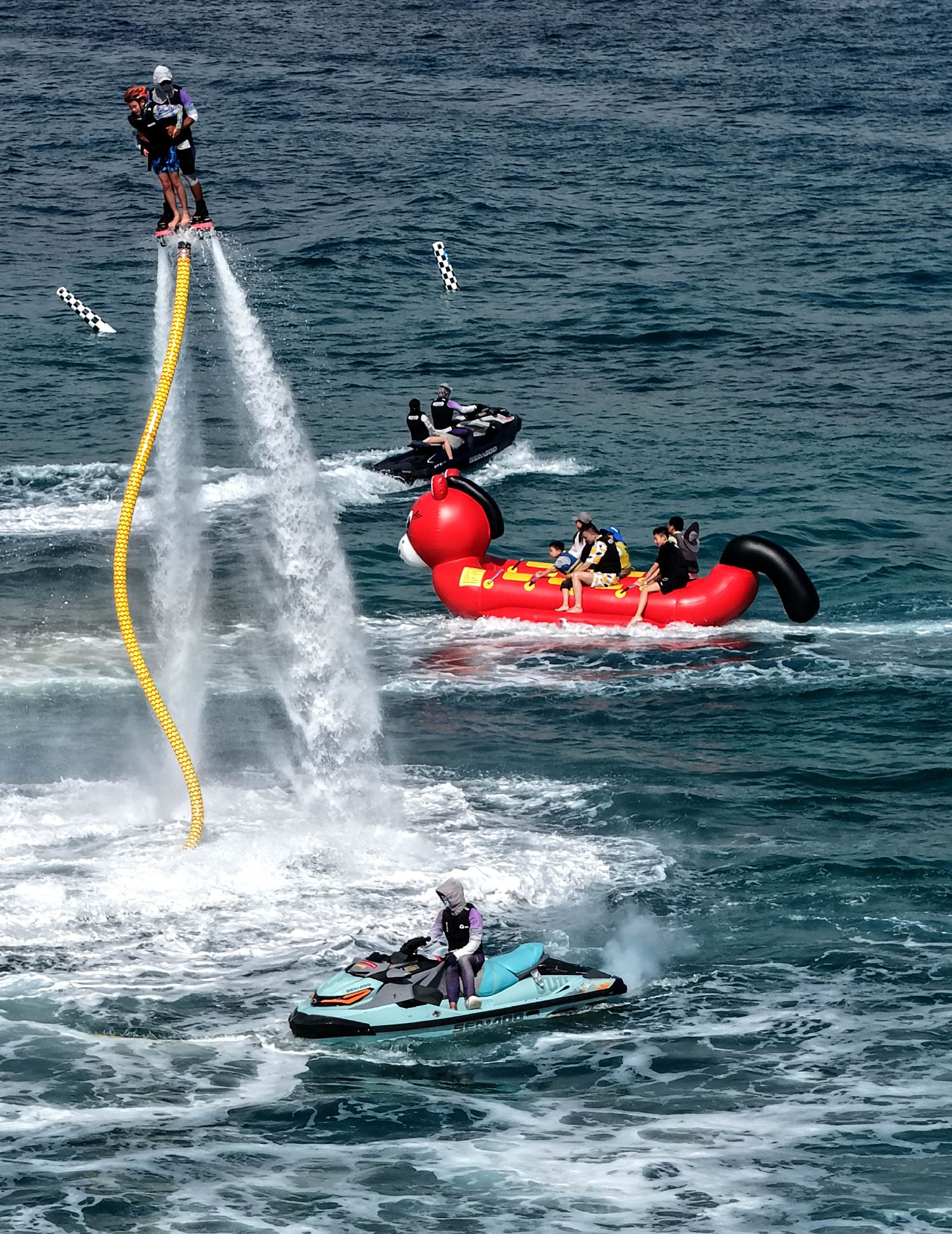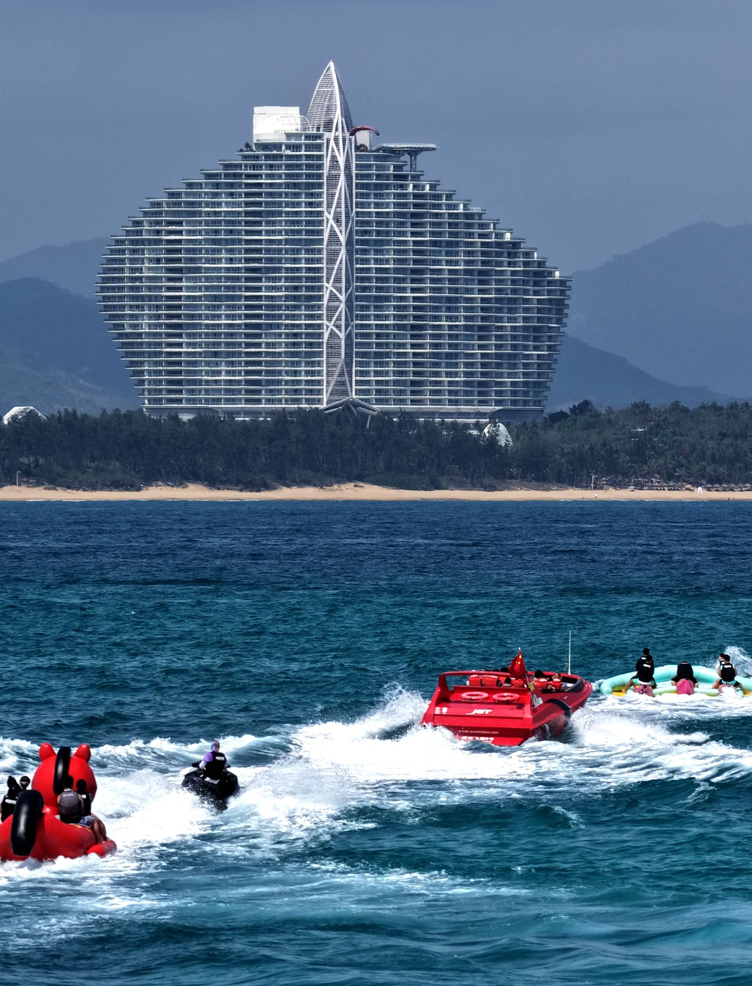 2月22日,游客在三亚市蜈支洲岛体验水上项目(无人机照片)。