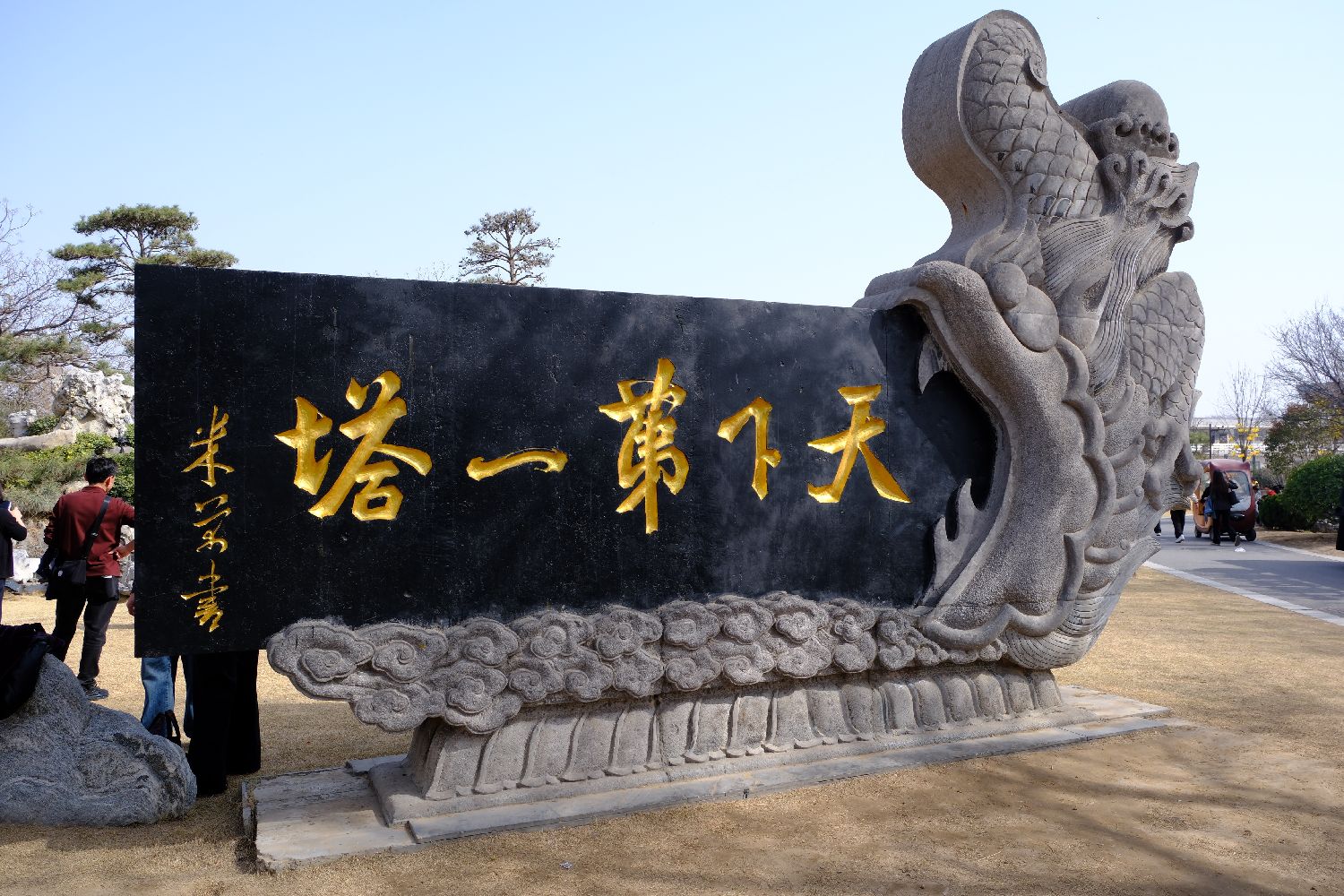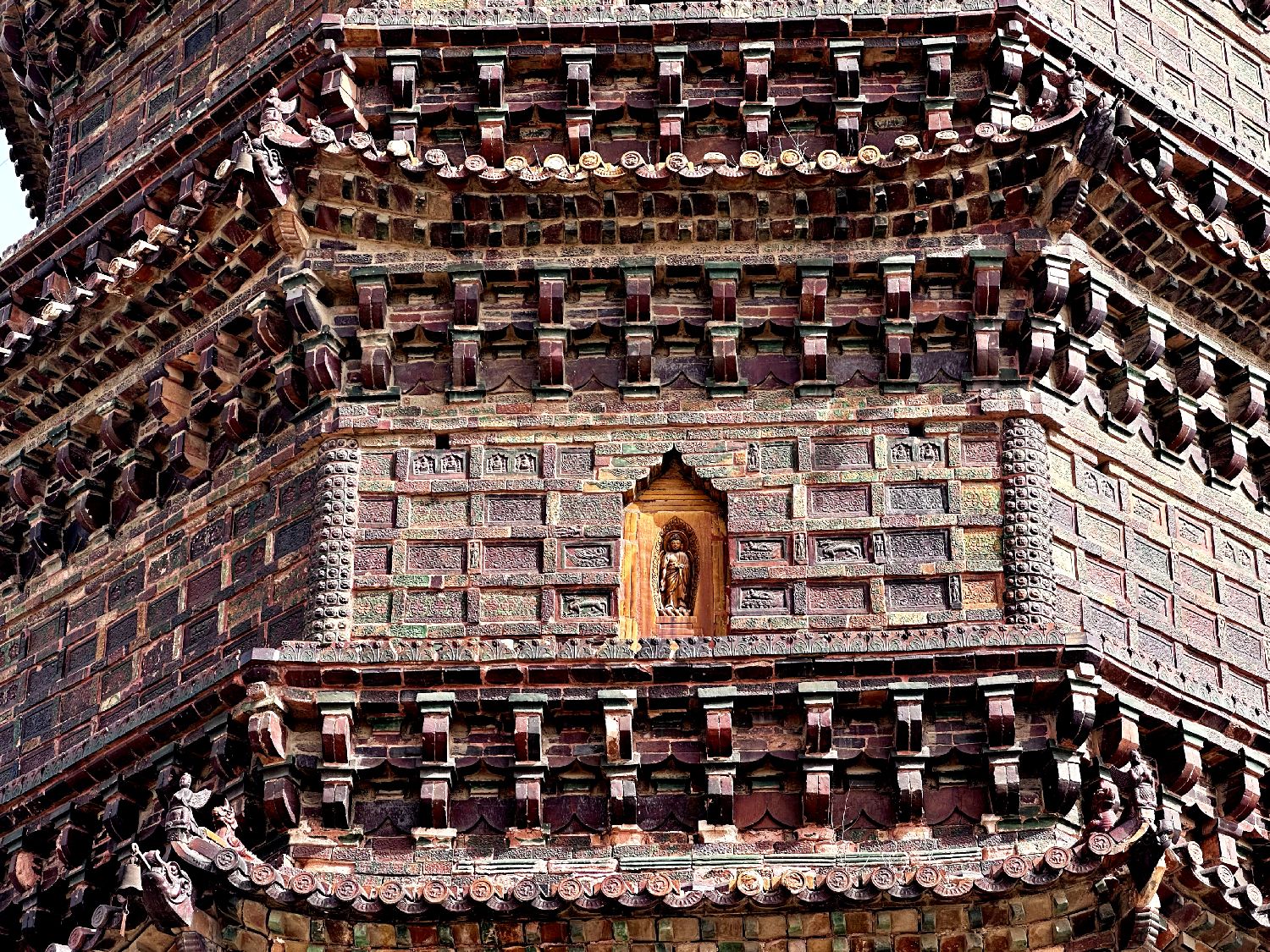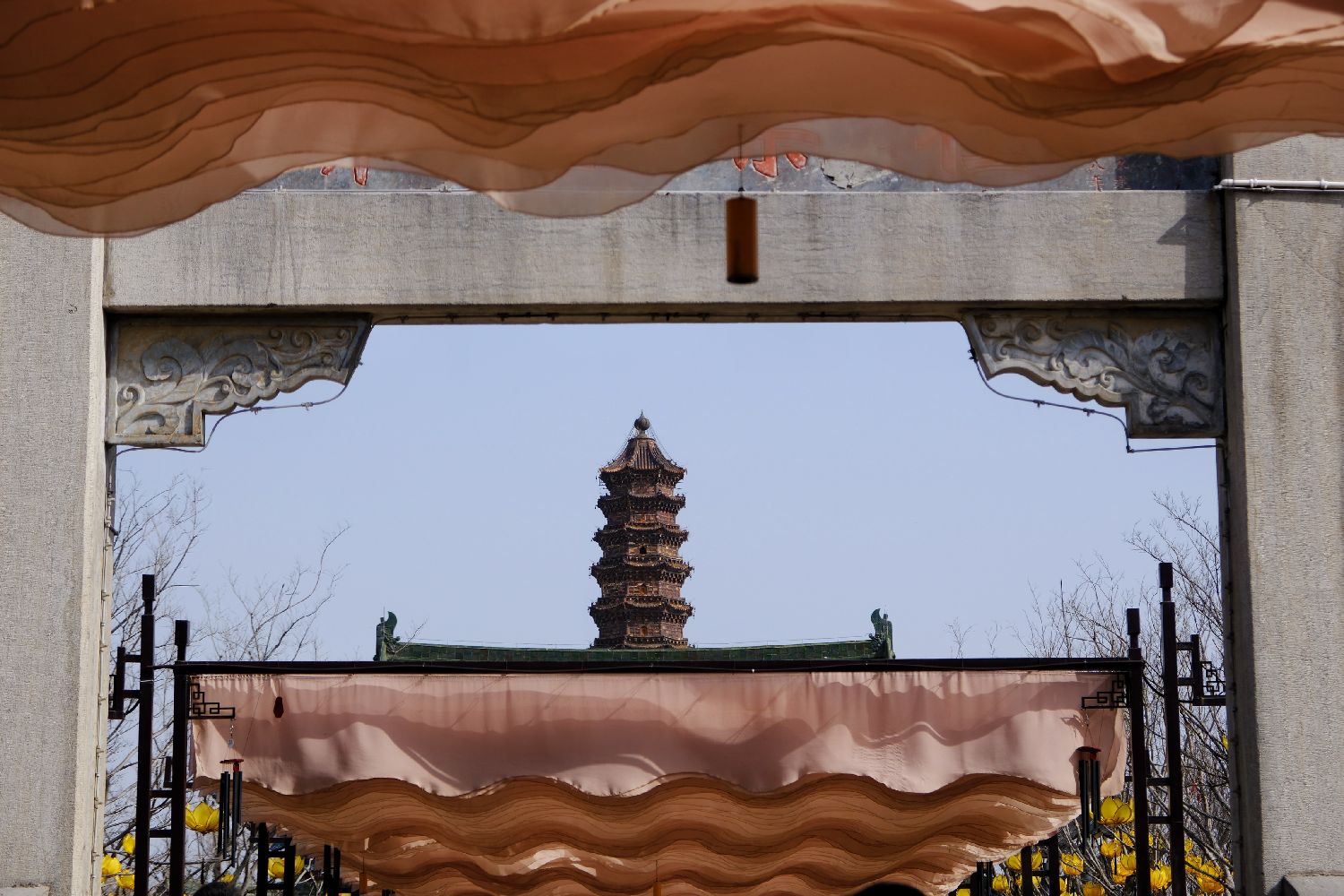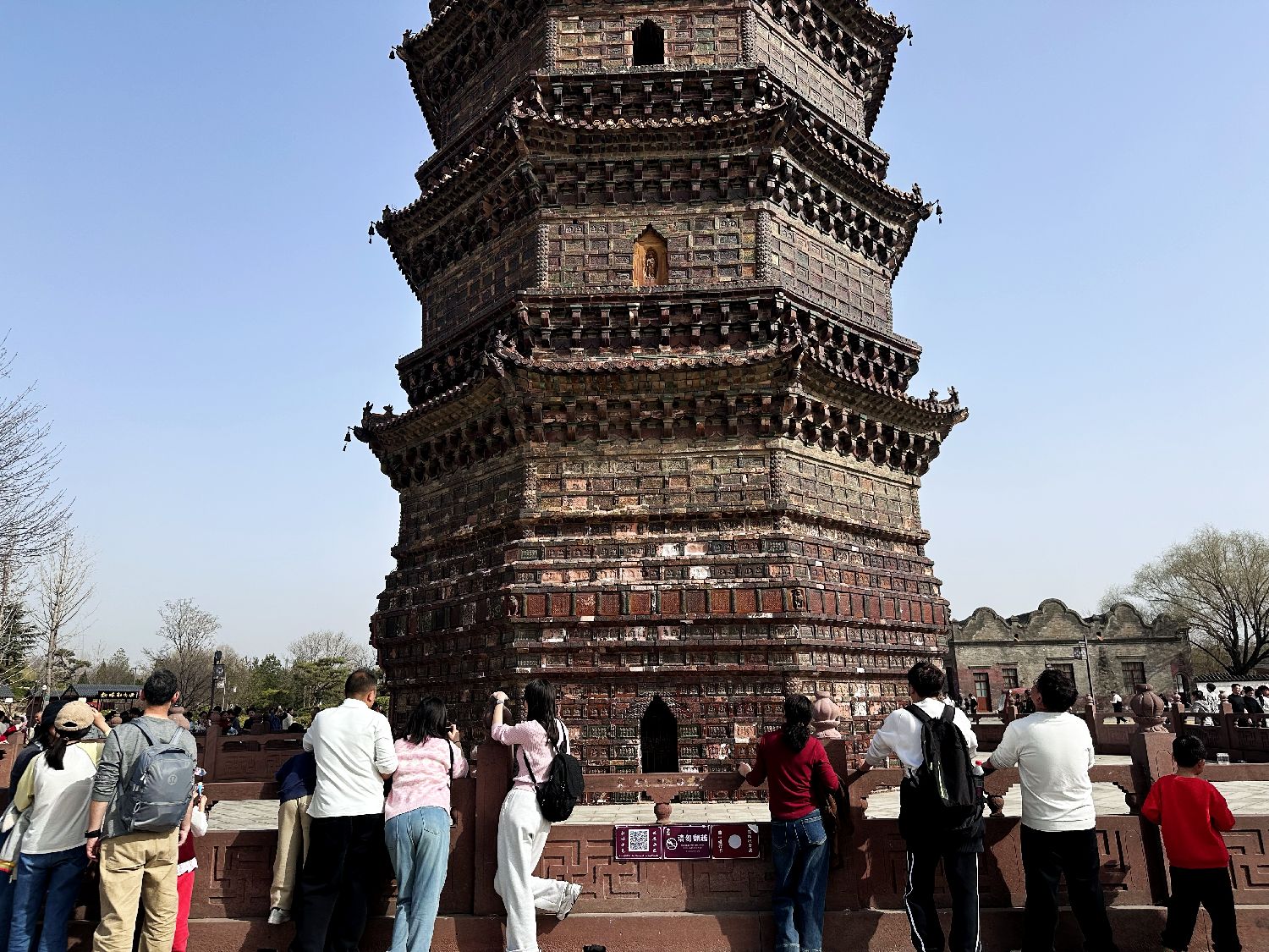 “铁塔”设计精巧,完全采用中国传统的木式结构形式,塔砖饰以飞天麒麟、伎乐等数十种图案,砖与砖之间如同斧凿,有榫有槽,垒砌严密合缝。图为游客近距离欣赏“铁塔”。
