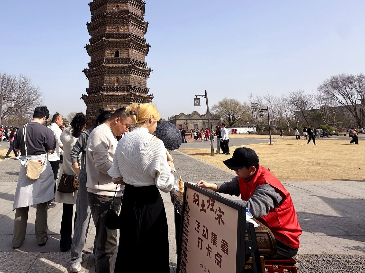 “铁塔”建成九百多年来,历经战火、水患、地震等灾害,依然屹立。随着历史剧《太平年》的热播,河南开封“铁塔”景区在2026年春节期间推出《太平年》主题打卡集章活动,让游客沉浸式感受这段历史。图为其中一个打卡摊位。