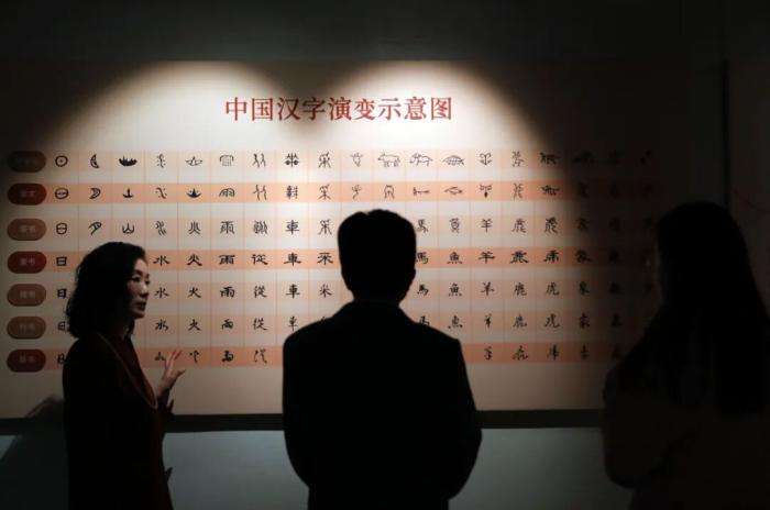 位于四川省成都市的东方汉字博物馆,是一家以汉字为主题的博物馆。图为参观者在东方汉字博物馆观看中国汉字演变示意图。(图片来源:中新社)