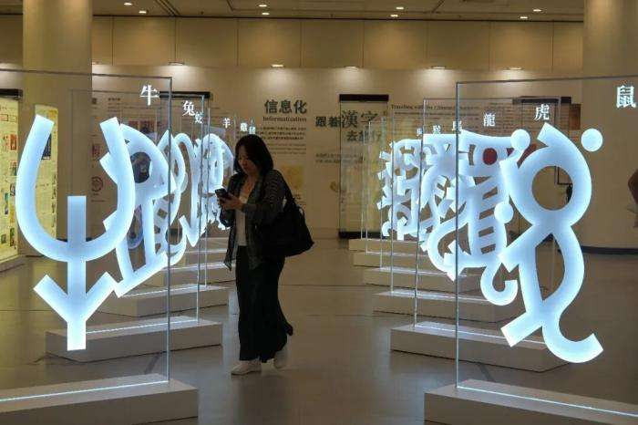 2025年7月11日,《了不起的甲骨文》展览在香港中央图书馆展览厅开幕。图为展览以不同的形式展示甲骨文。(图片来源:中新社)