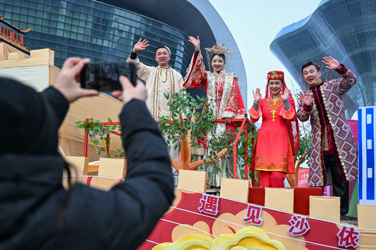 2月26日,演员在第二届“打起手鼓舞起龙”乌鲁木齐社火巡游展演活动中与市民互动。