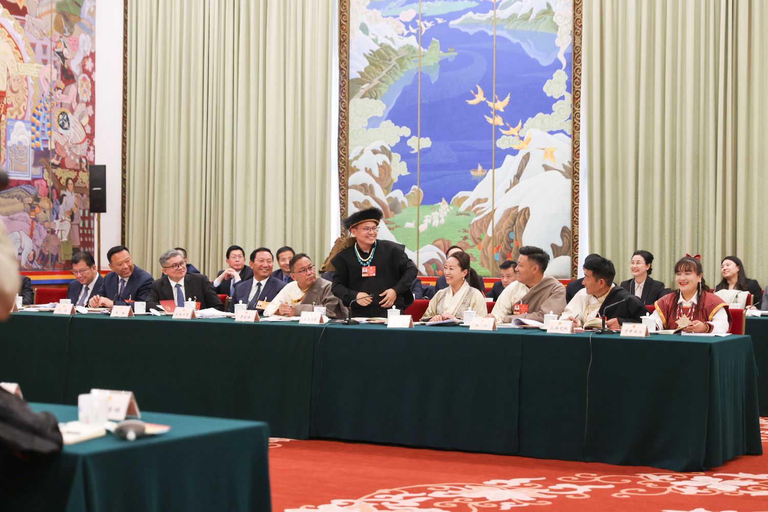 3月6日,全国人大代表扎西江村(中间起立者)身着珞巴族服饰,出席十四届全国人大四次会议西藏代表团开放团组会议。(图片来源:中新社)